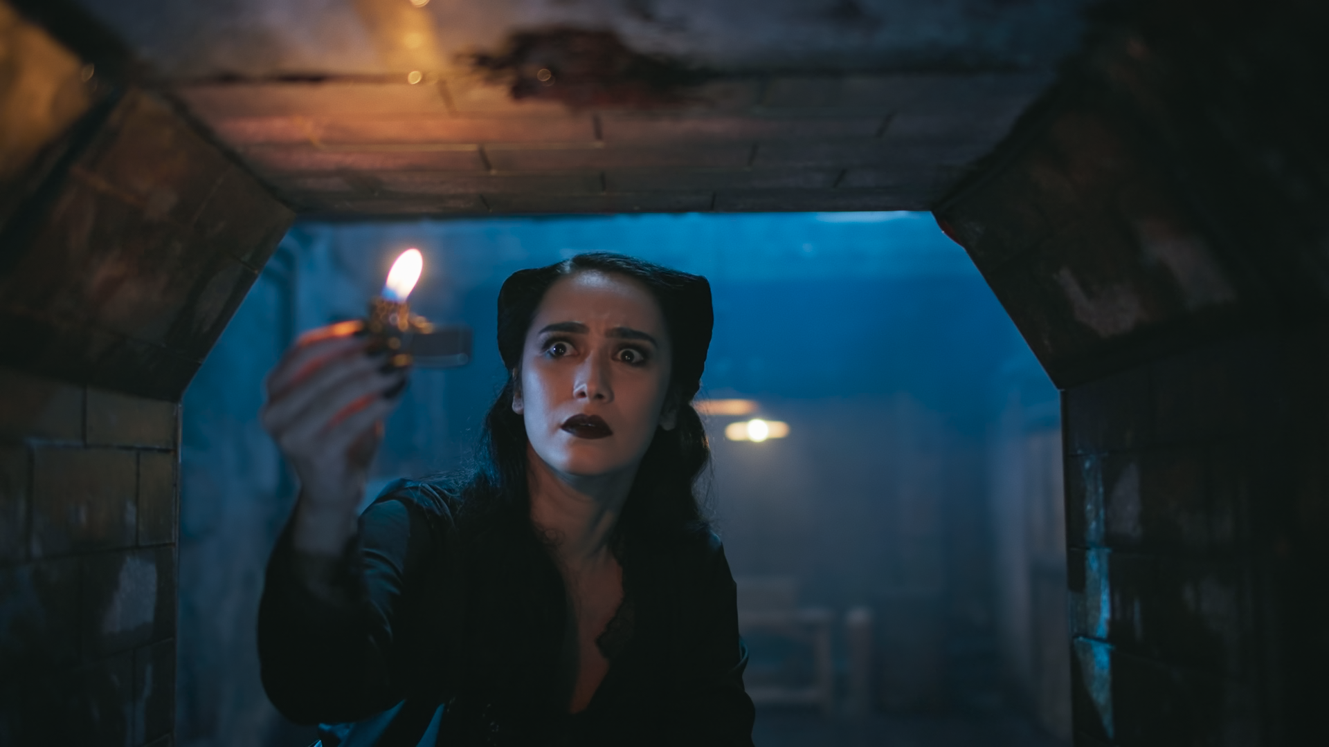A woman with black hair and dark lipstick holding a lit match under a brick archway in a dimly lit, mysterious setting.